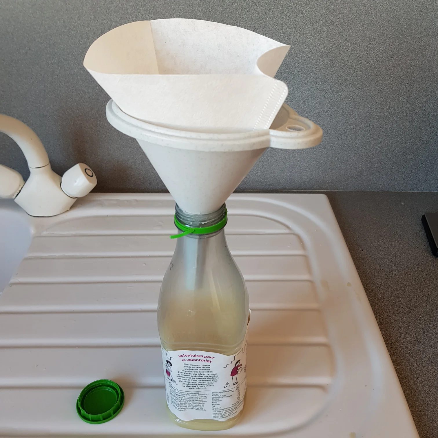 Pour cela, j’utilise une bouteille de jus de fruit vide, un entonnoir et un filtre à café. La graisse de bœuf est placée dans le filtre et le tout est placé dans un four chauffé à environ 60°C. L’entonnoir est régulièrement rempli de graisse. Après plusieurs heures, j’obtiens deux bouteilles et demie de graisse de bœuf. Tous les éléments solides en suspension sont restés piégés dans le filtre.