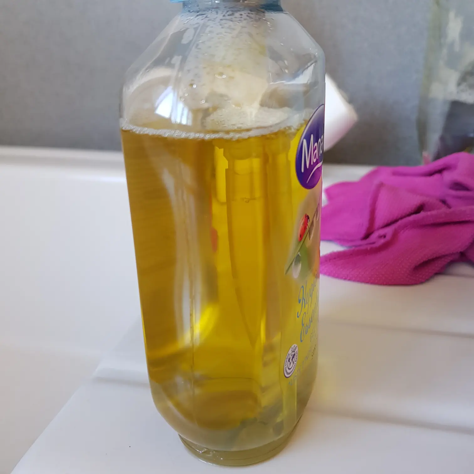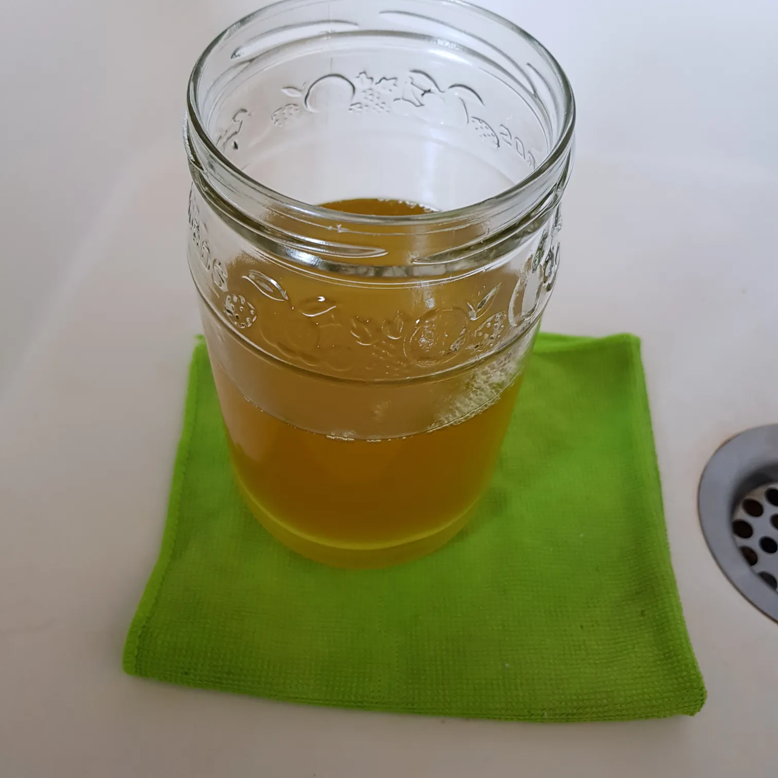 Le savon obtenu est jaune-vert, limpide, avec un tout petit peu de mousse séchée sur le dessus. Il est encore un peu trop visqueux à mon goût. J’ajoute encore 10 g d’eau, mélange, et c’est parfait. La consistance est proche de celle du savon liquide du commerce.