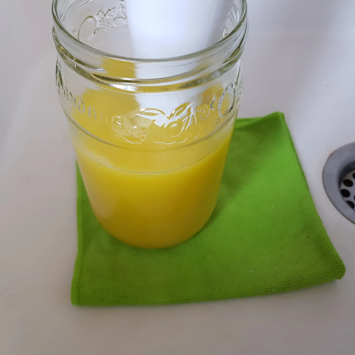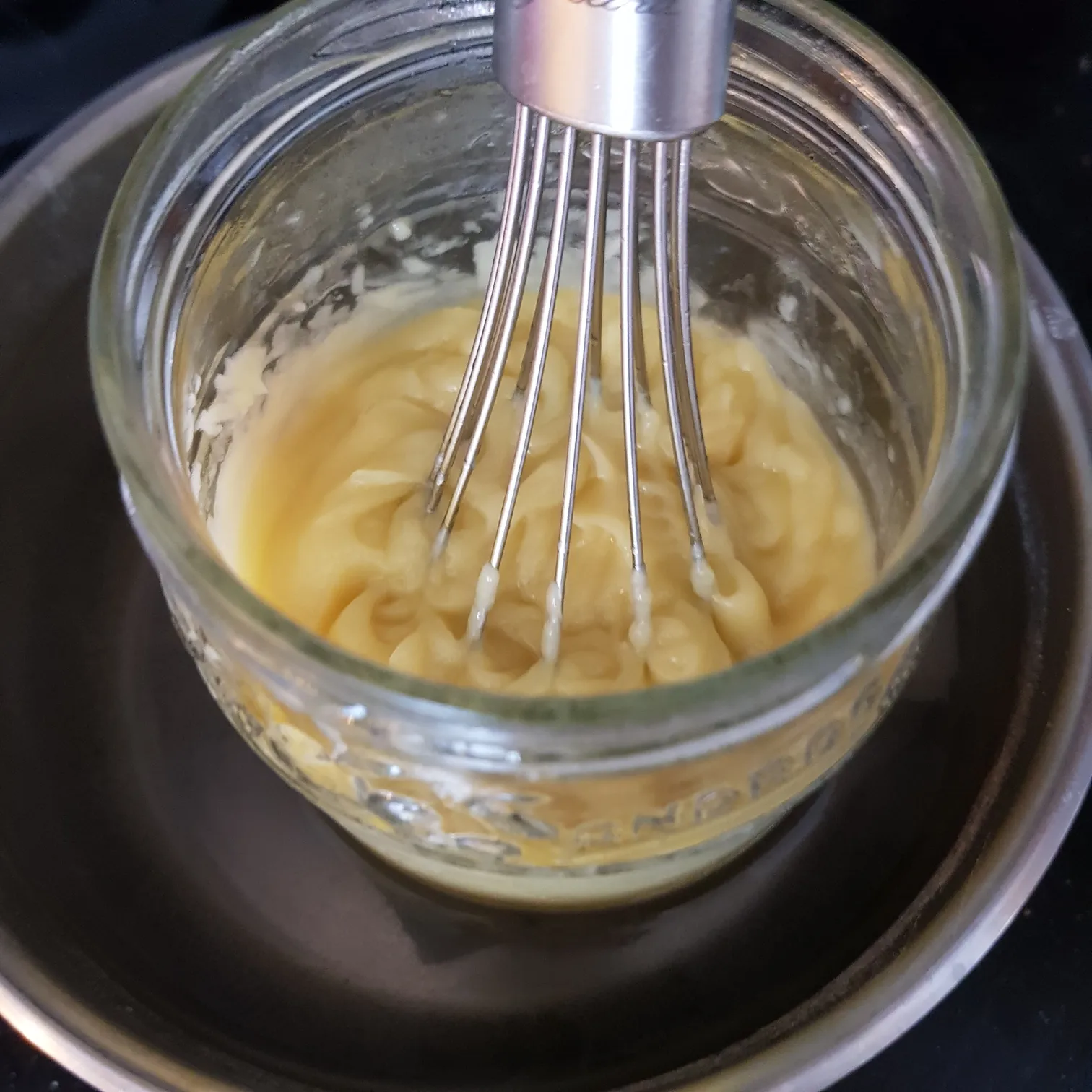 - Homogénéiser le mélange à l’aide d’un mixeur plongeant. Cesser de mixer lorsqu’une émulsion (non stable) est obtenue.